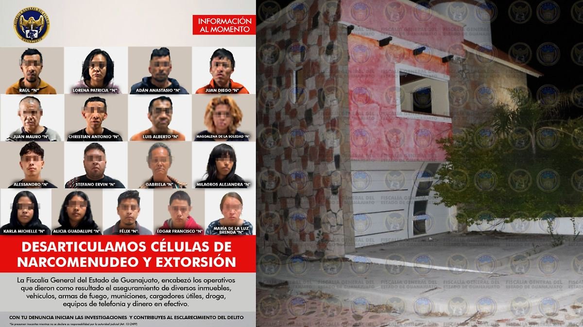 La Fiscalía General del Estado de Guanajuato logró desarticular una célula criminal dedicada al narcomenudeo y la extorsión en los municipios de León, San Francisco del Rincón, Irapuato y Celaya. Durante el operativo, fueron detenidas 17 personas, quienes permanecerán bajo custodia mientras se resuelve su situación legal.